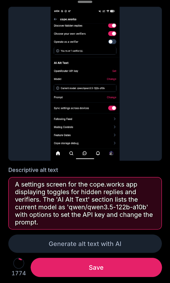 A settings screen for the cope.works app displaying toggles for hidden replies and verifiers. The ‘AI Alt Text’ section lists the current model as ‘qwen/qwen3.5-122b-a10b’ with the options to set the API key and change the prompt.