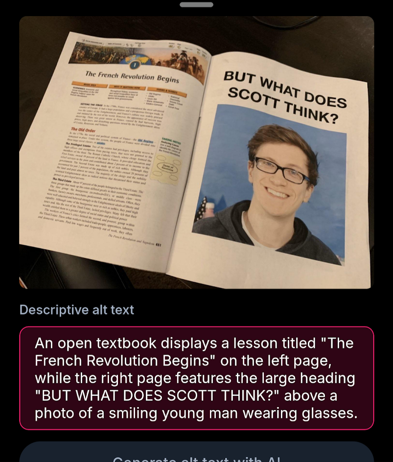 An open textbook displays a lesson titled “The French Revolution Begins” on the left page, while the right page features the large heading “BUT WHAT DOES SCOTT THINK?” above a photo of a smiling young man wearing glasses.