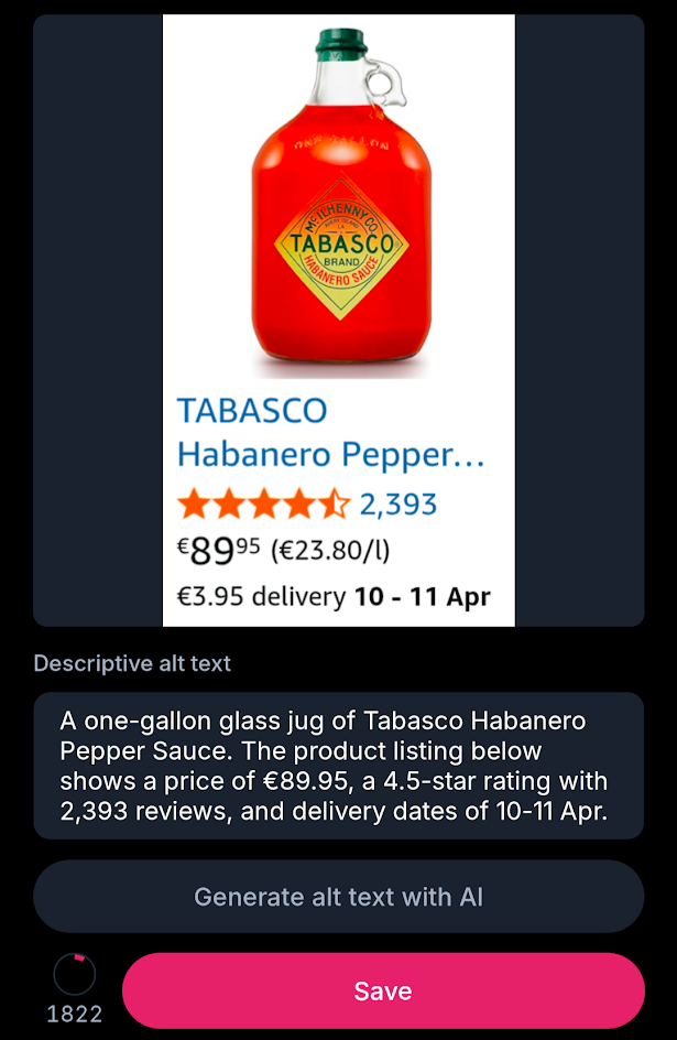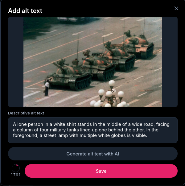 Some people keep insisting that AI (which is a term I try to avoid, here I am calling them VLMs) cannot be good sources of alt text. My belief is that they can, even if it’s not as good as a human written one, it can be made to be better than one that’s never written, or form a good base for someone to edit. Both of those would be a net positive. I personally want to write more alt text but often don’t, and felt that something like this could be a good base for me to just read and confirm, or edit and push forward.